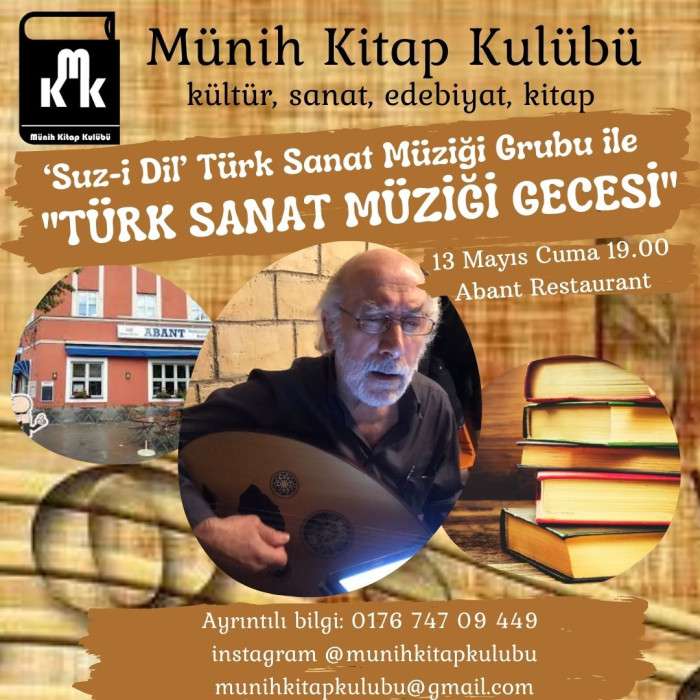 Münih Kitap Kulübü çok özel bir etkinlikte daha kitapseverler ile bir araya geliyor. Münih’te 40 yıldır faaliyet gösteren ‘Suz-i Dil’ Türk Sanat Müziği Korosu üyeleri, sanat yönetmeni Udi Bestekar Ahmet Mavruk önderliğinde Münih Kitap kulübü ile buluşuyor.