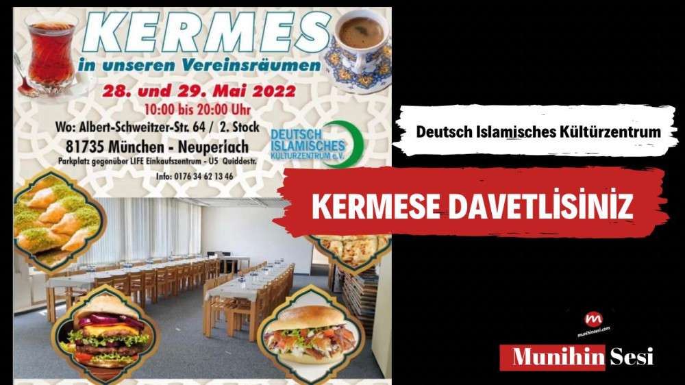 Deutsch İslamisches Kulturzentrum e.V. tarafından 28 – 29 Mayıs tarihleri arasında Kermes düzenlenecek. Albert-Schweitzer-Str.64 / 2. Kat 81735 Neuperlach adresinde gerçekleştirilecek olan Kermesi saat 10.00 ile 20.00 saatleri arasında ziyaret edebilirsiniz.