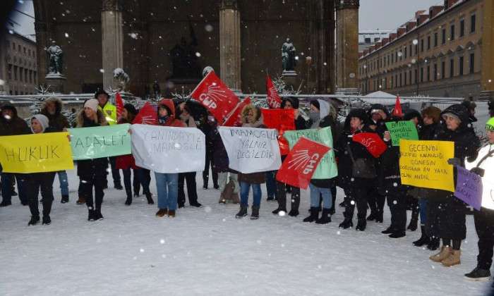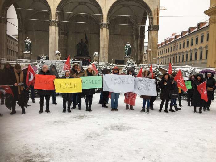 İstanbul Büyükşehir Belediye Başkanı Ekrem İmamoğlu’na verilen hapis cezası ve siyasi yasak kararına Almanya’dan büyük tepki geldi. Yoğun kar yağışı ve eksi derecedeki hava soğukluğuna rağmen ellerindeki dövizler ve pankartlarla bir araya gelen siyasi parti temsilcileri ile sivil toplum kuruluşları yaptıkları Türkçe ve Almanca konuşmalarda; “Sarayın talimatıyla İmamoğlu’na verilen ceza hukuksuz ve hükümsüzdür” açıklaması yaptılar.