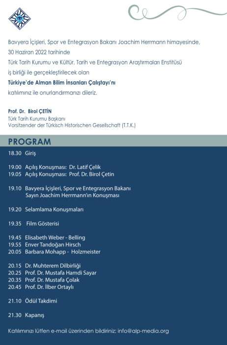 Türkiye’den ise konuyu çalışan ve Türk- Alman Bilimsel İşbirliği alanında yayın, eser ve makaleleri olan akademisyenlerden Dr. Muhterem Dilbirliği, Prof. Dr. Mustafa çolak ve Prof. Dr. İlber Ortaylı katılacaklardır.