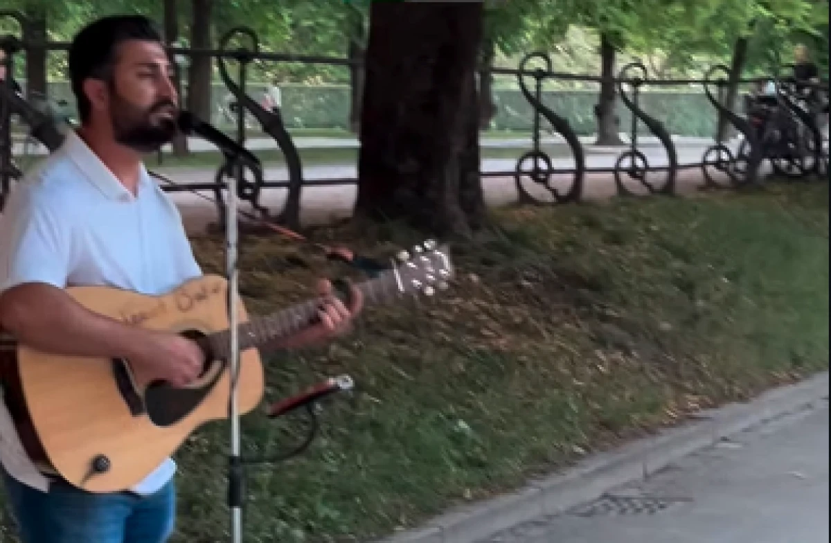 Sokak müzisyenleri İzzet ve Şerif, Münih sokaklarında söyledikleri Ahmet Kaya şarkıları ile yoldan geçenlerden tam not aldı.
