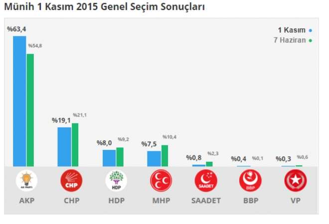 1 Kasım 2015 genel seçim sonuçları belli oldu. Münih'te AKP 07 Hazirana oranla oylarını arttırırken CHP'nin oyları düştü. İşte sonuçlar.