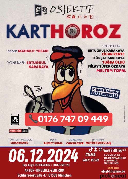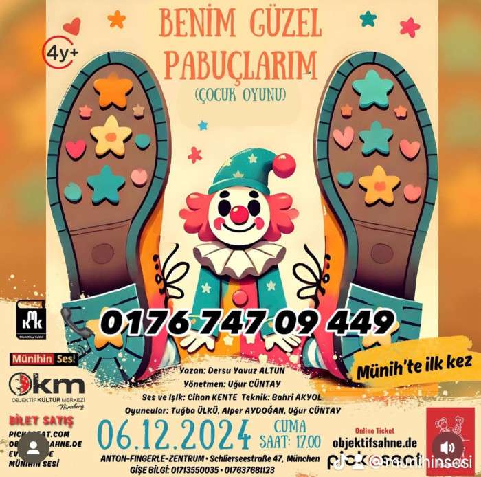 Objektif Kültür Merkezi Münih tarafından, Münihin Sesi ve Münih Kitap Kulübü destekleri ile 06 Aralık Cuma günü saat 17.00’de Anton-Fingerle-Zentrum'da çocuklar için Benim Güzel Pabuçlarım, saat 20.30’da ise yetişkinler için Kart Horoz oyunları sahnelenecek.