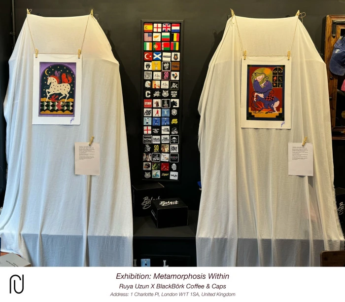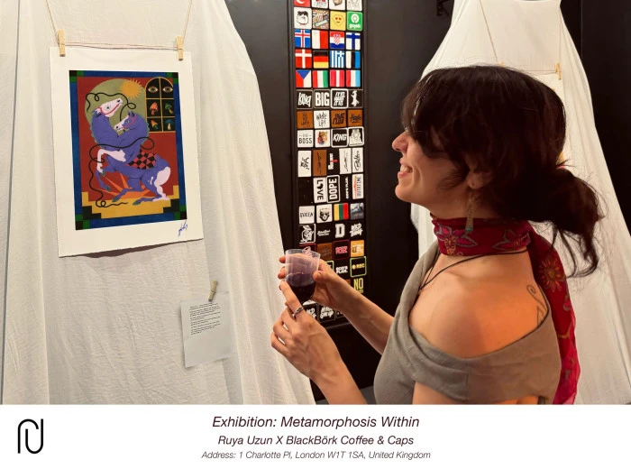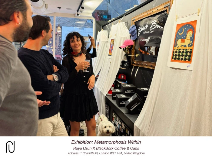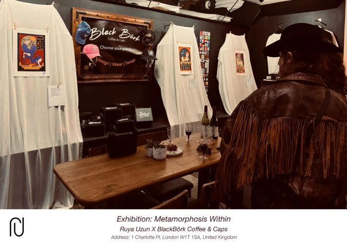 Londra – 24 Temmuz 2025. Soho’nun yaratıcı atmosferi bugün özel bir işbirliğine ev sahipliği yaptı. İstanbul ve Londra arasında üretim yapan multidisipliner sanatçı Rüya Uzun, yeni serisi “Metamorphosis Within” ile BlackBörk Coffee & Caps’te tek günlük bir sergi gerçekleştirdi.