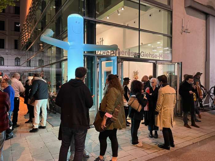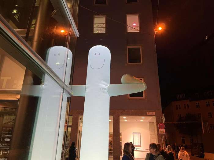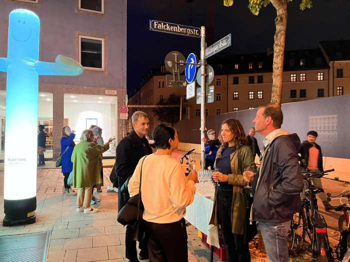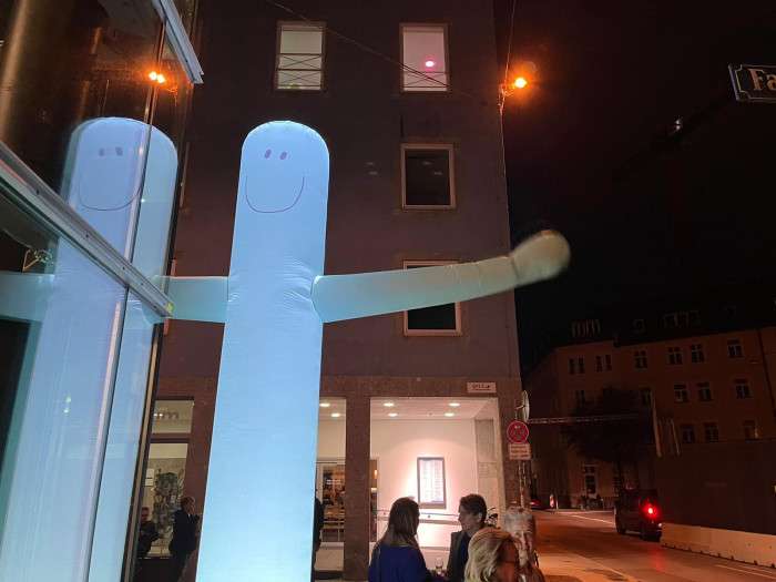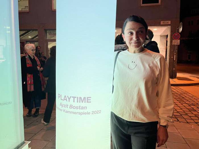 Ayzit Bostan, Kammerspiele Tiyatrosu’nun açılışında Jacques Tati'nin 1967 tarihli aynı adlı filminden esinlenen “Playtime” (Oyun Zamanı) adlı enstalasyonunu sergiledi. Tiyatronun kapısında gülümser bir yüz sanatseverleri karşıladı.