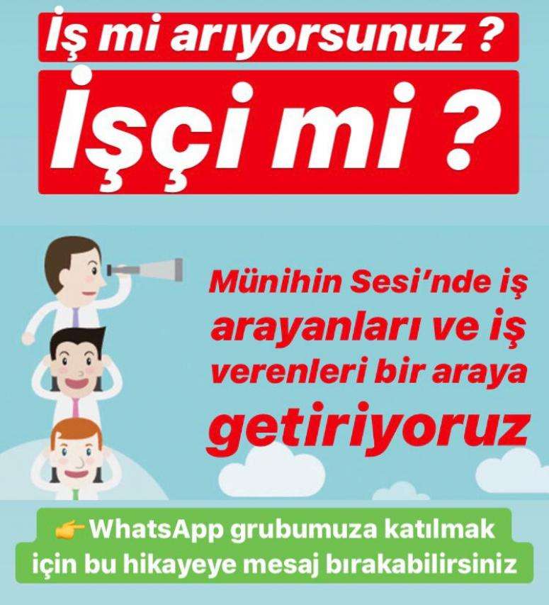 Münihin Sesi’nde bir sosyal sorumluluk projesi daha gerçekleştiriyor Münih ve çevresinde “İŞ ARAYANLAR ile İŞ VERENLERİ” aynı platformda buluşturuyoruz.    “Birlikten kuvvet doğar”  sloganını kendimize ilke edinerek yaşadığımız şu sıkıntılı günlerde birbirimize daha fazla destek olmalıyız diyoruz.  Bu amaçla iş arayan kişilerin iş bulmasında yardımcı olmak, işçi arayan işletmelere istihdam sağlamak için başlattığımız sosyal sorumluluk projesini sizlere sunuyoruz.   Münih ve çevresinde gözünüze çarpan, duyduğunuz iş ilanlarını gruptan paylaşırsanız belki bir vatandaşımıza iyiliğiniz dokunur.  Unutmayınız ki “İyi insanlar, başka insanların iyiliklerini teşvik ederler"   Siz de WhatsApp grubumuza katılmak istiyorsanız bu iletiye mesaj bırakmanız yeterli olacaktır.    İş ve İşçi Bulma  ile ilgili projemizi  sosyal medya hesaplarımızdan takip edebilirsiniz;    Instagram: www.instagram.com/munihinsesi   Facebook: www.facebook.com/munihinsesi   Facebook Grup: www.facebook.com/groups/munihinsesi   WhatsApp Grup: +90 5368638699 (Linke tıklayarak gruba üye olabilirsiniz)