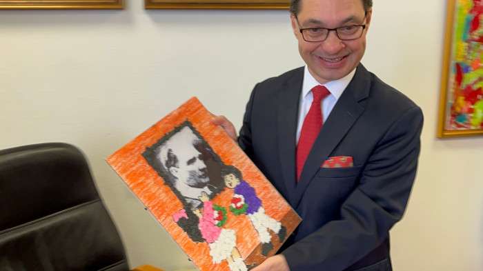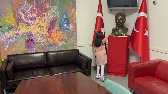 Ellerindeki Türk bayrakları ile birlikte Atatürk büstüne çiçek bırakan çocuklar, 23 Nisan Yüzüncü Yıl Marşı eşliğinde konsolosluk makamına çıktı. Münih Başkonsolosu Süalp Erdoğan çocukları kapıda karşıladı ve hepsine tek tek teşekkür etti.