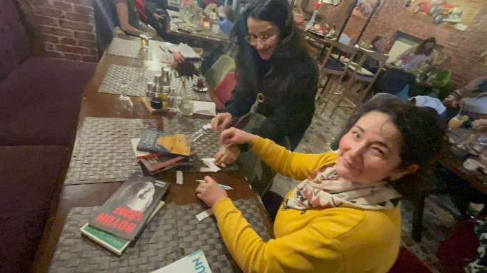 Yemeğin ardından Münih Kitap Kulübü’nün olmazsa olmazı Türkçe kitap çekilişine geçildi. Getirilen kitapların isimleri ufak kağıtlara yazılarak bir şapkanın içine atıldı. Kitap getirenlerin katıldığı çekilişle kitaplar yeni sahiplerini buldu.