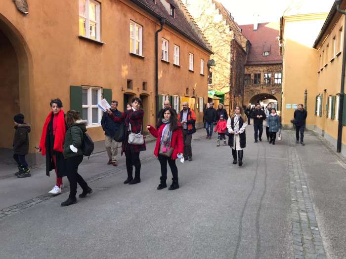 Yaklaşık 25 kişinin katıldığı günübirlik gezi Augsburg’un meşhur dönercisi Seval Döner’de yenen öğle yemeği ile başladı. Yemeğin ardından ünlü Alman Yazar Bertolt Brecht’in doğduğu ev ziyaret edildi. Brecht, 10 Şubat 1898'de bu evde doğdu. Brecht, ailesi 1900'de evden taşındığı için ünlü yazar bu evde kısa bir süre kaldı. Brecht, tüm çocukluğunu ve gençliğini Augsburg'ta iki farklı adreste yaşadı. Augsburg Belediyesi Brecht’in doğduğu yeri sembolize etmesi için bu evi müze haline getirdi.