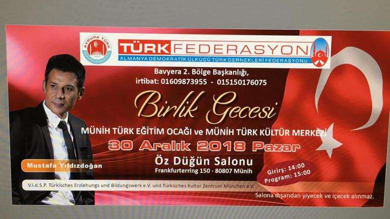 Almanya Demokratik Ülkücü Türk Dernekleri Federasyonu çatısı altında Münih Türk Eğitim Ocağı ve Münih Türk Kültür Merkezi tarafından 30 Aralık Pazar günü Birlik Gecesi düzenlenecek.