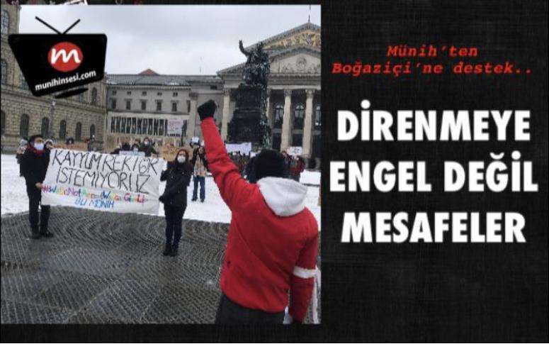 Boğaziçi Üniversitesi’ne Cumhurbaşkanlığı kararnamesi ile kayyum rektör atanmasına ilişkin protestolara üç bin kilometre öteden destek geldi. Almanya’nın Münih şehrinde yaşayan Boğaziçi Üniversitesi mezunları ve Türkiye’deki üniversite direnişini destekleyenler, 16 Ocak Cumartesi günü gerçekleştirdikleri eylemle demokratik seçim olmadan yapılan rektör atamasına karşı tepkilerini göstererek taleplerini bildirdiler.