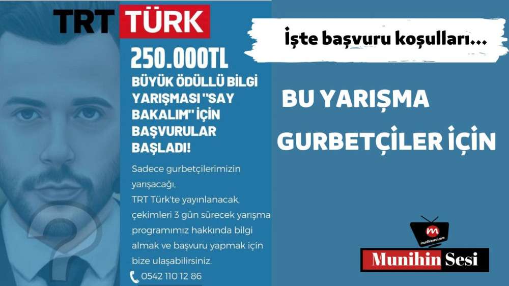 TRT ekranlarında sadece gurbetçilerin yarışacağı 250.000 TL büyük ödüllü bilgi yarışması “Say Bakalım” için başvurular başladı. Çekimleri üç gün sürecek yarışma programına katılacak olan yarışmacıların ulaşım ve konaklama masrafları karşılanacak. Program hakkında detaylı bilgi almak ve başvuru yapmak için 0542 110 12 86 numaralı telefondan bilgi alabilirsiniz. Programın detaylarına haberin devamından ulaşabilirsiniz.