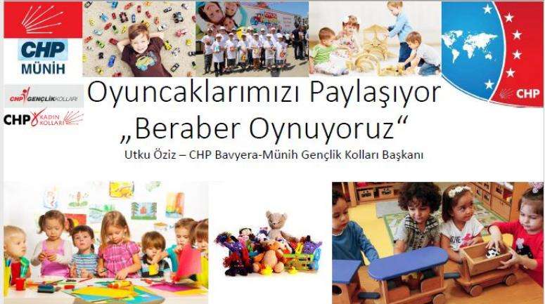 CHP-Bavyera Münih e.V. Gençlik Kolları ve Kadın Kolları tarafından gerçekleştirilen organizasyonda "Oyuncaklarımızı paylaşıyor, beraber oynuyoruz" sloganı ile bir proje başlatıldı. Proje de Avrupa’daki çocukların kullanmadıkları oyuncaklar Türkiye'deki belediyelere ait  anaokullarına gönderilecek.   CHP-Bavyera Münih Gençlik Kolları Başkanı Utku Öziz yaptığı açıklamada; „Amacımız Bavyera'dan başlayarak Türkiye ve Almanya arasında daha sonra da diğer Avrupa ülkelerinde kardeş anaokulu kurmak. Sürdürülebilir bir dünya, bir gelecek için kullanılmayan oyuncaklarımız toplanıp oyuncak oynaması gereken küçük ellere teslim edilmeli. Çocuklarımızın beyin gelişiminde bir hayli önemi olan bu oyuncaklar tozlu raflarda, kolilerde, garaj ve depolarda değil küçük ellerde mutlu anasınıflarında olmalı. Oyuncaklar bir köşede kalmasın,  çocuklarımız tarafından oynansın.  Tüm hemşerilerimizden, vatandaşlarımızdan  Alman ve her kökenden olan komşularımızdan eski oyuncaklarını bekliyoruz” dedi.   Münih ve çevresinde bulunan oyuncaklar CHP Bavyera Münih (Landsberger Str. 183 Eingang West, 80687 München) adresinde toplanıyor. Munihinsesi.com / özel
