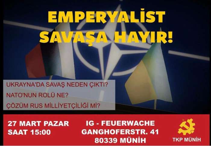 TKP (Türkiye Komünist Partisi) Münih tarafından 27 Mart Pazar günü saat 15.00’te IG-FEUERWACHE GANGHOFERSTR.41 80339 adresinde “Emperyalist Savaşa Hayır” söyleşisi düzenlenecek.