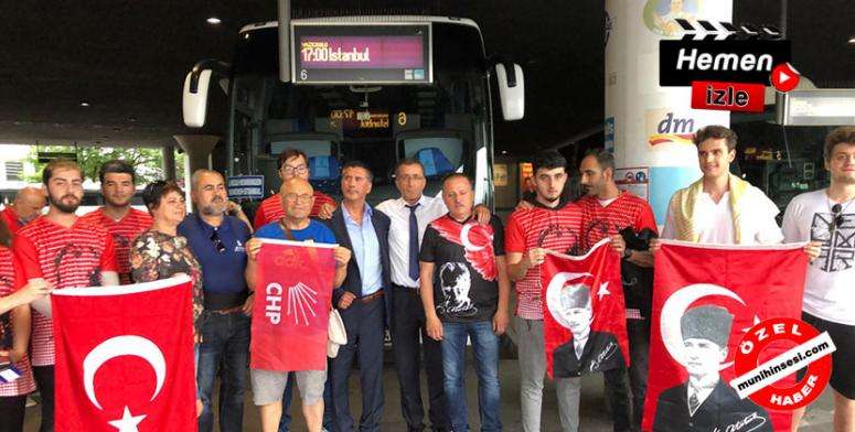 CHP Münih-Bavyera Birliği organizasyonu ile Münih'ten İstanbul'a oy vermek için otobüsle gidecek olan öğrenciler Türk bayrakları ve Atatürk posterleri ile „Her şey çok güzel olacak“ sloganları eşliğinde kalabalık bir grup tarafından önceki gün Münih Otogarı'ndan uğurlandı.
